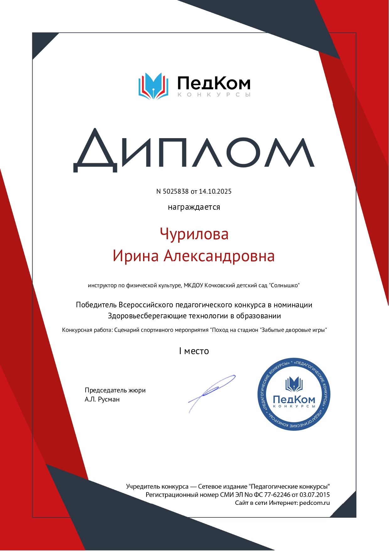 Диплом Всероссийского педагогического конкурса Сценарий похода на мини- стадион "Чтоб здоровым быть, нужно спортом заниматься"