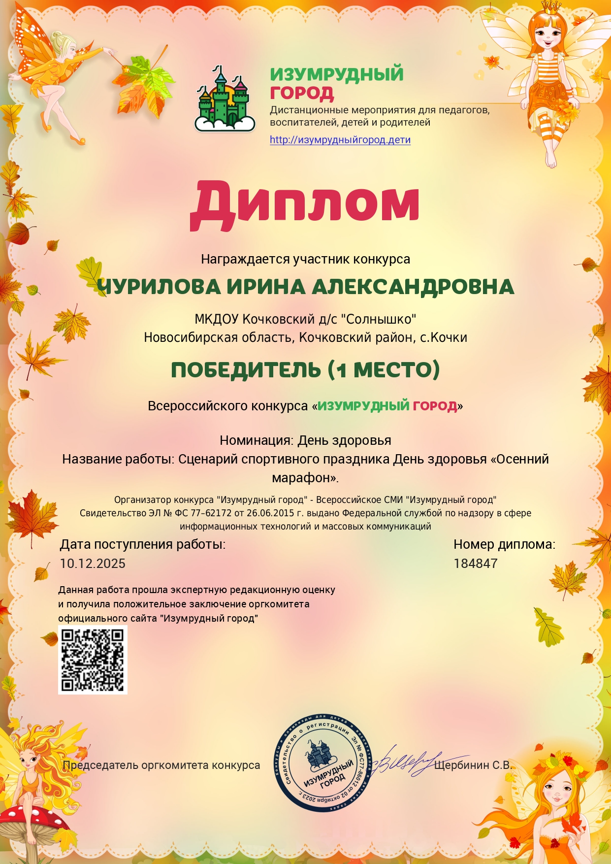 Диплом Номинация: Сценарии праздников и мероприятий в детском саду, школе, семье и т.д. Название: Квест игра для педагогов ДОУ "Здоровый педагог"