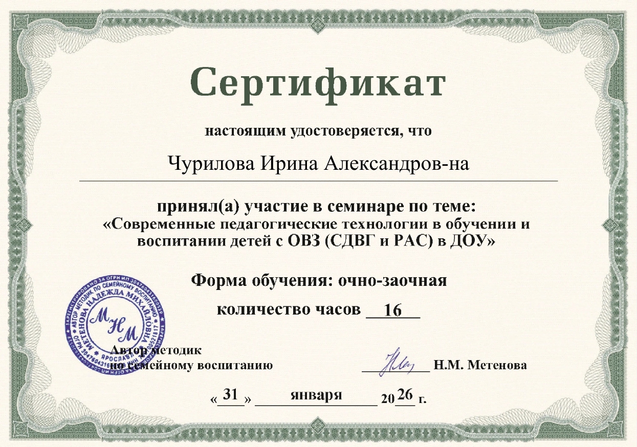 Сертификат приняла участие в семинаре по теме: "Современные педагогические технологии в обучении и воспитании детей с ОВЗ (СДВГ и РАС) в ДОУ 16 часов 31.01.2025