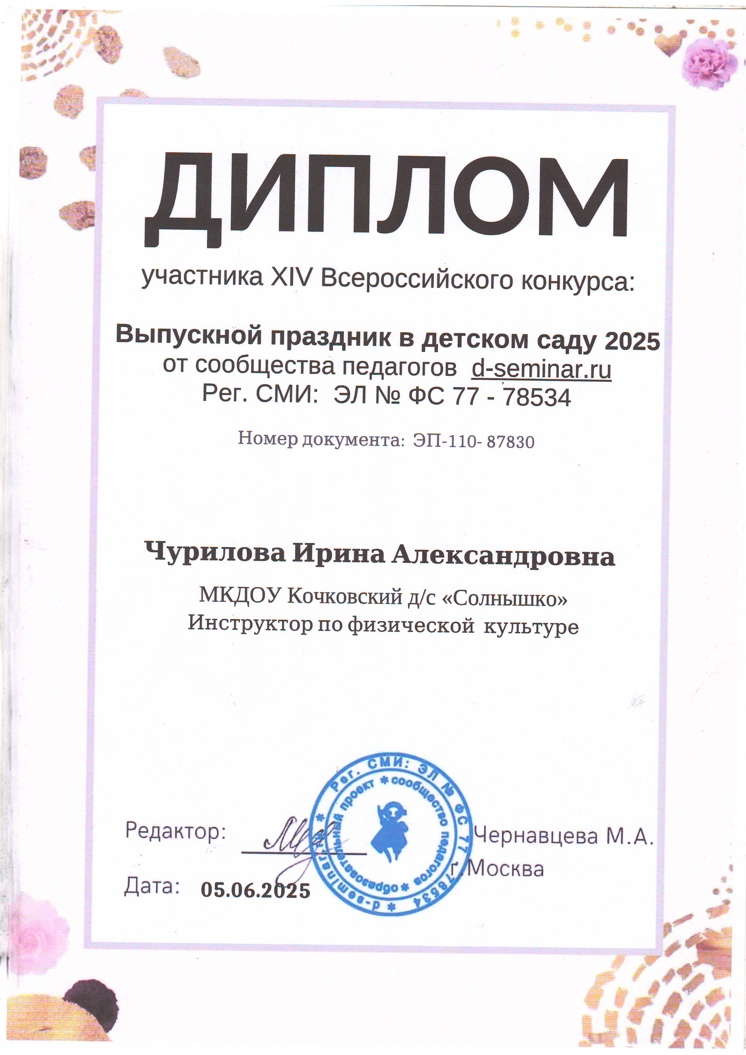 диплом участника 14 Всероссийского конкурса: Выпускной праздник в детском саду 2025 номер документа: ЭП-110-87830 05.06.2025