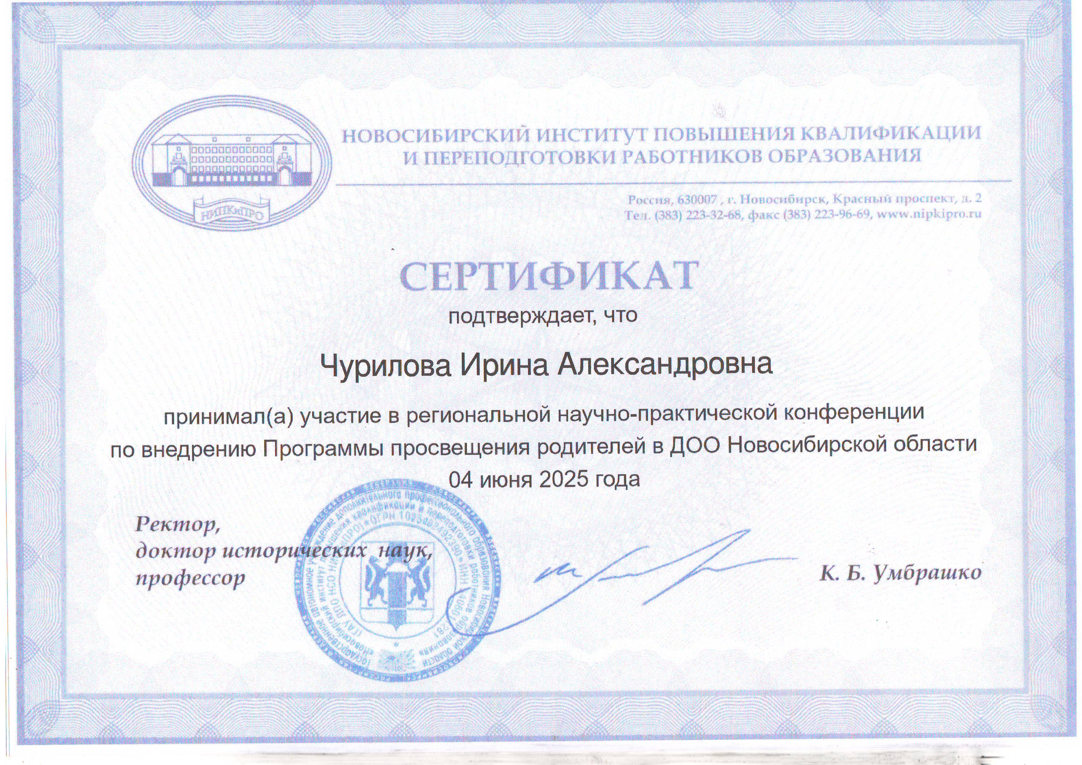 Сертификат. участие в региональной научно- практической конференции по внедрению программы просвещения родителей в ДОО Новосибирской области 04 июня 2025г