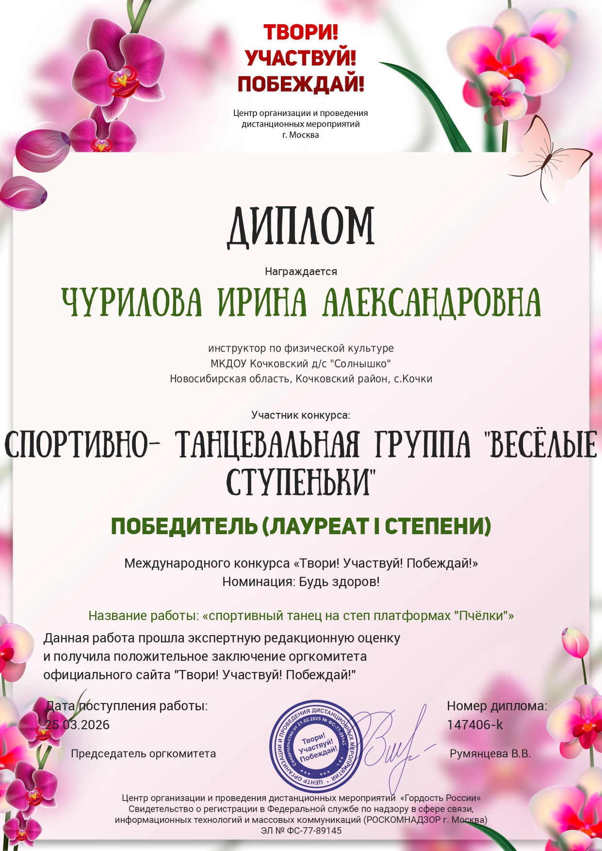 Диплом , участник конкурса "Спортивно танцевальная группа "Весёлые ступеньки", 1 место в международном конкурсе "Твори, участвуй, побеждай", номинация:"Будь здоров!", название"Спортивный танец на степ платформах "Пчёлки", номер:147406-k