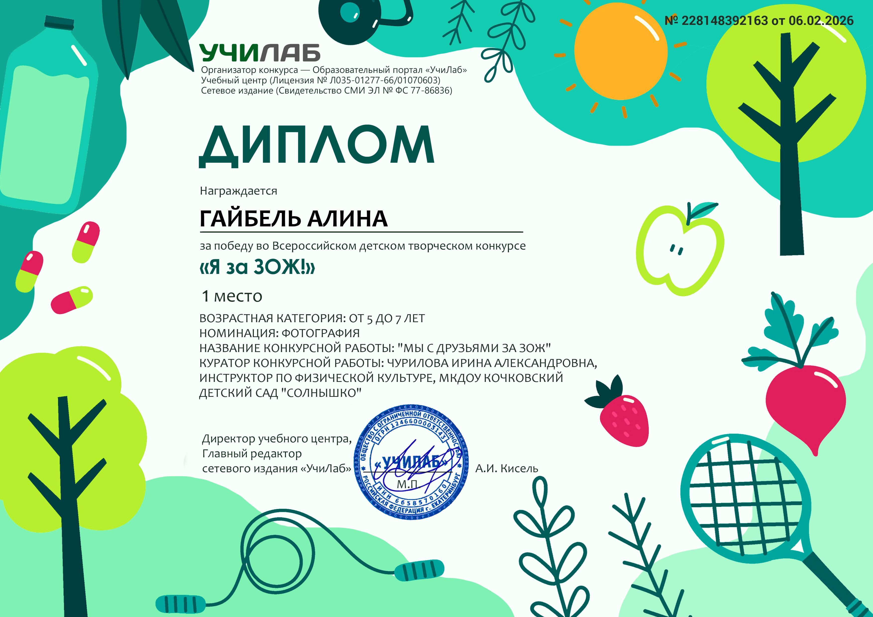 Диплом УЧИЛАБ Гайбель Алина 6 лет, за победу во всероссийском творческом конкурсе "Я за ЗОЖ!"номинация :фотография,название:"Мы с друзьями за ЗОЖ!"