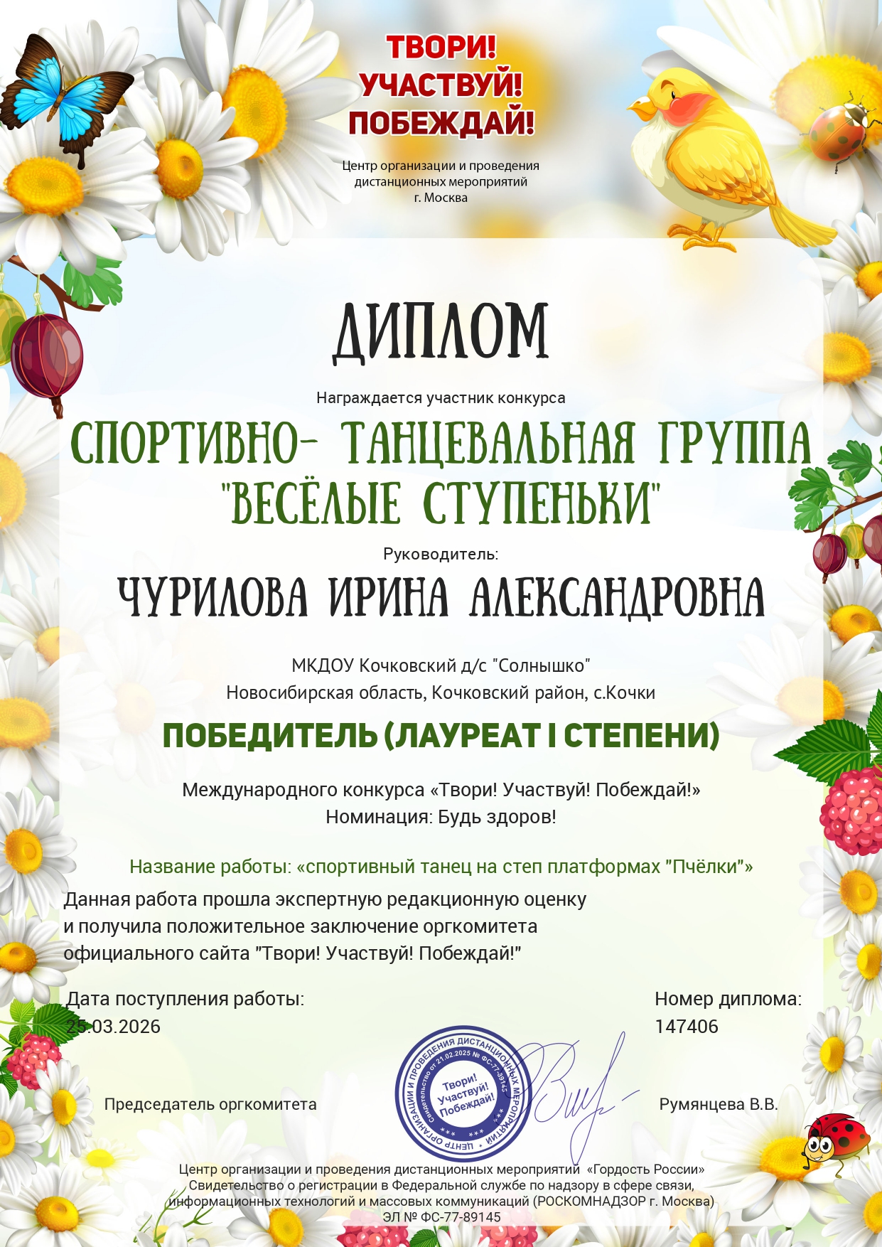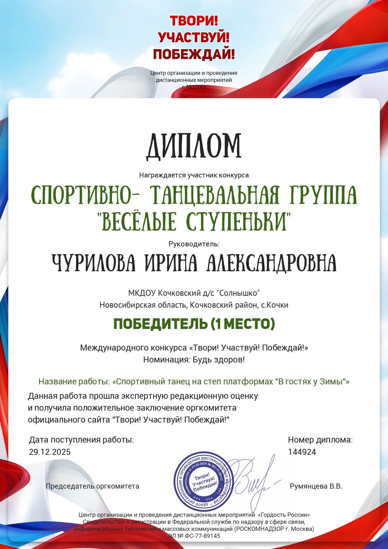 Диплом Спортивно-танцевальная группа "Веселые ступеньки" Победитель 1 место международного конкурса "Твори, участвуй, побеждай!" номинация: "Будь здоров" название: спортивный танец на степ платформах "В гостях у зимы"
